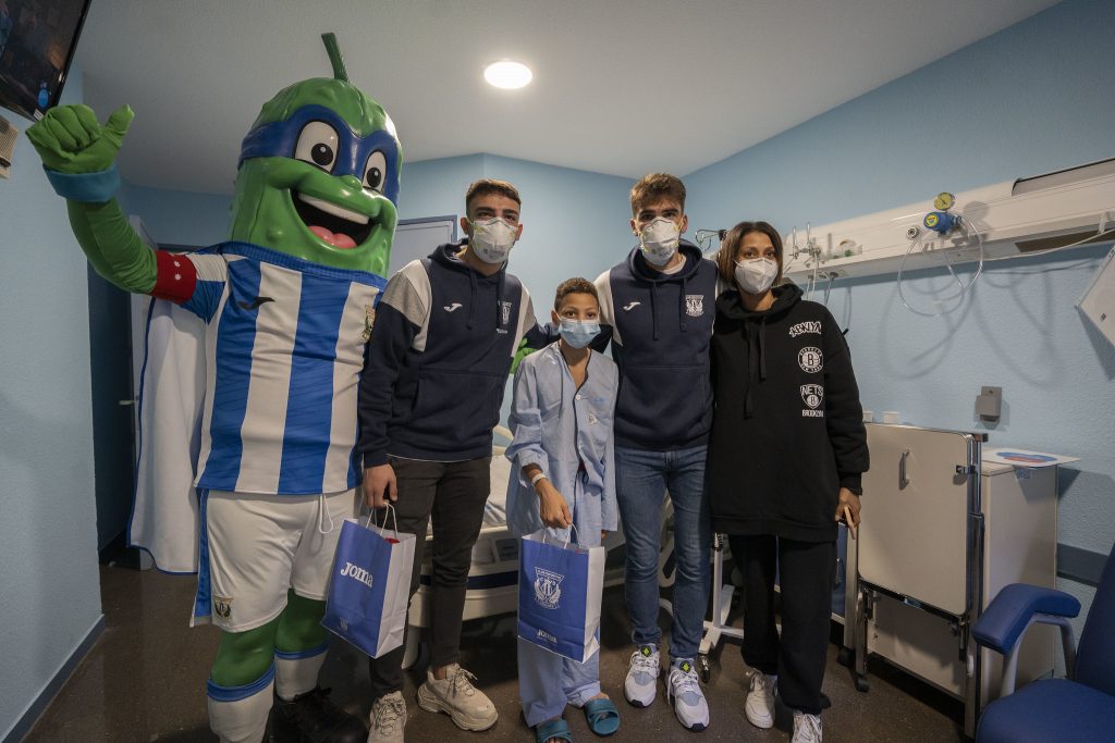 El director general del CD Leganés, Martín Ortega; los futbolistas Juan Muñoz, Sergio González, Jorge Miramón, Iker Undabarrena y Naim García; así como la mascota oficial del club, SuperPepino, han visitado este miércoles a los pacientes del Hospital Severo Ochoa en unas fechas muy especiales para ellos.