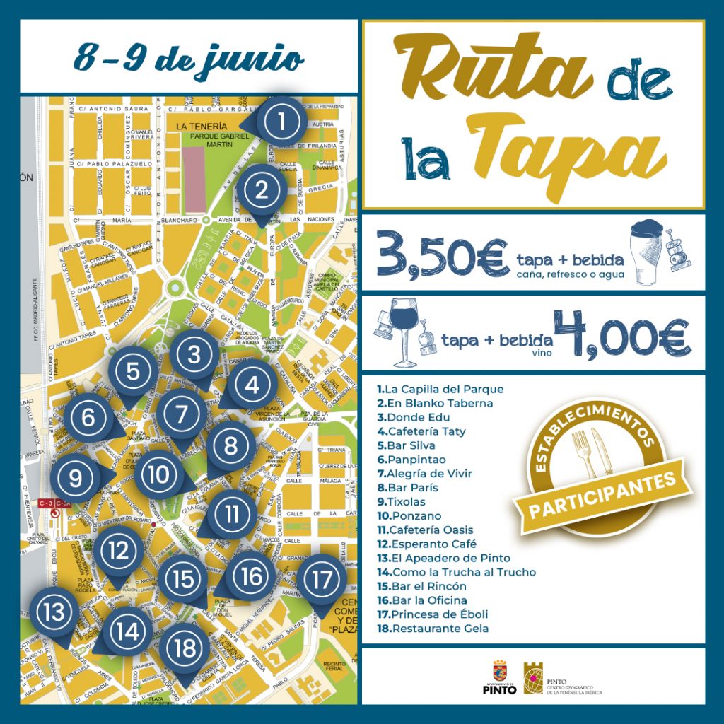 Una veintena de comercios hosteleros de Pinto se han inscrito en esta edición. Los participantes ofrecerán su tapa con una caña, refresco o agua por 3,50 euros; o tapa + bebida (vino) por 4,00 euros dentro de su horario de apertura. Los establecimientos informarán de alérgenos a los clientes.
