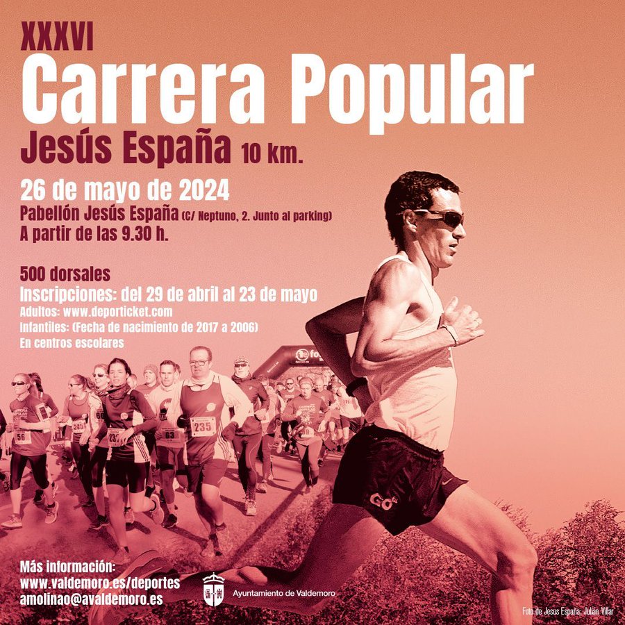 El Ayuntamiento de Valdemoro recupera el domingo 26 de mayo la Carrera Popular Jesús España, que alcanzará de este modo su 36ª edición cinco años después de que la anterior se celebrase en 2019. La carrera partirá desde el pabellón Jesús España (junto al aparcamiento) a las 9:30 horas y los participantes deberán completar un recorrido de 10 kilómetros.