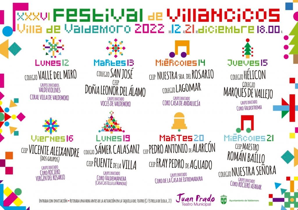 Hasta el 21 de diciembre, colegios y grupos invitados se subirán al escenario del Teatro Municipal para ofrecer al público su banda sonora para estas fechas. Las citas son a las 18.00 h.; la entrada, con invitación y además se emitirá en directo por canal de YouTube del Juan Prado