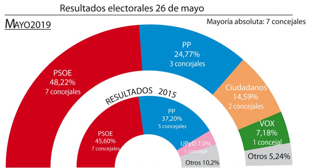 En total, Valle Luna obtuvo 1.289 sufragios en estos comicios municipales. El PSOE repite el número de concejales que tuvo durante la pasada legislatura con siete representantes, subiendo dos puntos respecto a 2015 y revalidando, de esta forma, la mayoría absoluta.