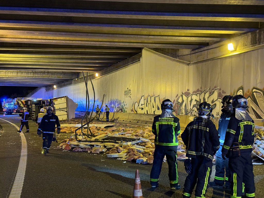 Vuelca un camión que cargaba 30 toneladas de jamones frescos y obliga a cortar la R-4 en Getafe
