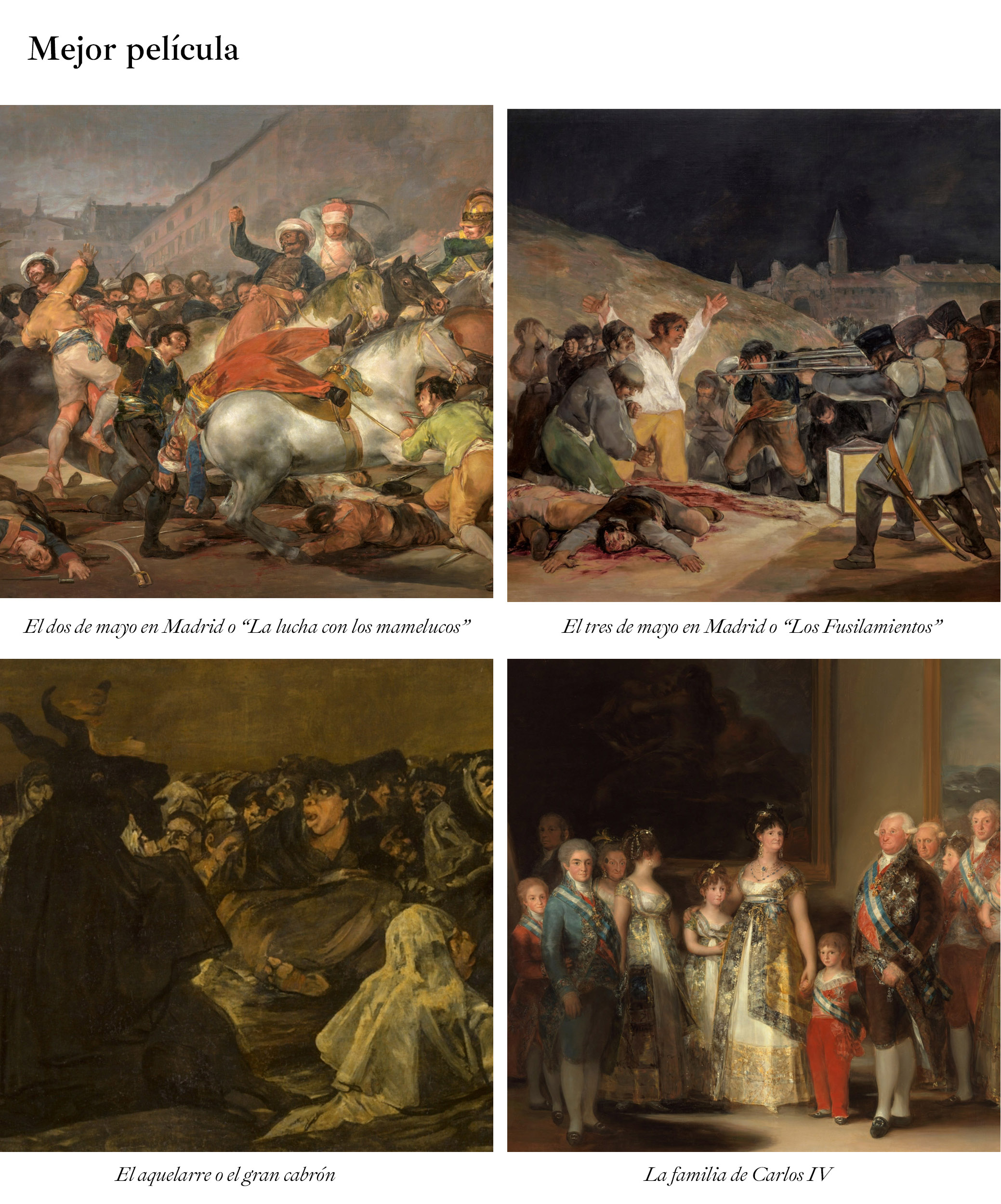 Así, hasta el 10 de febrero, el público podrá participar en la elección de los Premios Goya de Goya en el Museo Nacional del Prado entre las obras nominadas en las categorías de:
