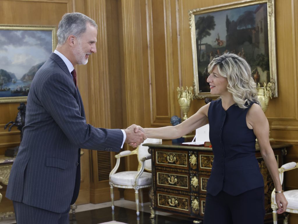 La vicepresidenta segunda del Gobierno y líder de los comunistas de Sumar, Yolanda Díaz, ha asegurado este lunes al Rey de España Felipe VI, que su partido está aún «muy lejos» de alcanzar un acuerdo con el PSOE para conformar un nuevo Gobierno de coalición.